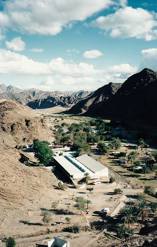 Ai Ais itself was pleasant enough, but very touristy (not that we are tourists you understand), with tour busses coming in, in the afternoon and leaving at sparrows next morning. The baths are in a large building. There are 2 large swimming pool types with equipped with water massages (large pipes that shoot water at you at speed), and also a couple of Jacuzzis. Temperatures range from warm to hot to Ai Ais!! All quite modern and jacked up but tending to be a bit scruffy. The baths and the awesome scenery are the main attraction, but a number of people do an 80 k walk through the canyon ending up at Ai Ais. It takes 3 to 4 days and there are no facilities, you carry everything. Most hikers do not carry tents because, as we all know, it rarely rains in the desert.